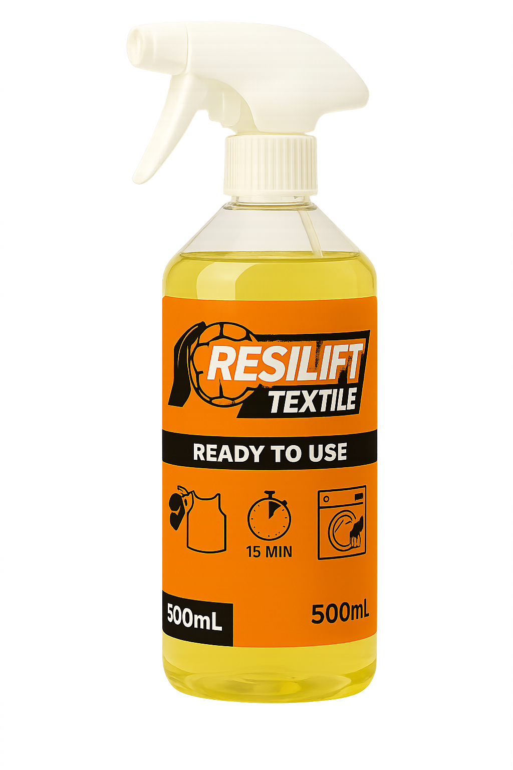 RESILIFT TEXTILE est un détachant résine textile handball qui élimine les taches de colle incrustées dans les maillots, chasubles et brassards sans dégrader les fibres techniques ni altérer les flocages sur les maillots. Pulvérisateur prêt à l’emploi, il s’utilise avant lavage et complète la gamme RESILIFT pour traiter la résine du parquet jusqu’au vestiaire.